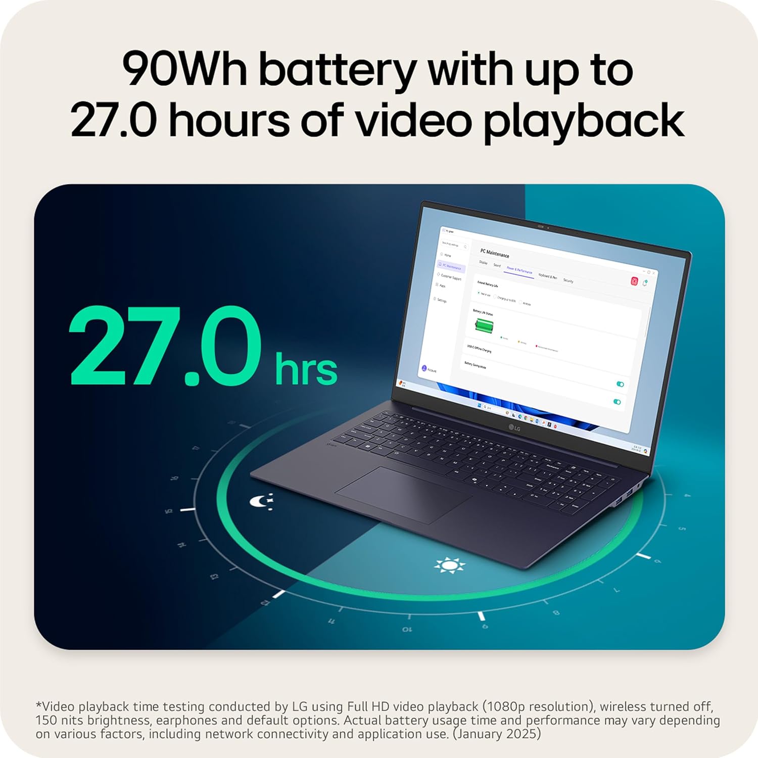 ⁵Video playback time testing conducted by LG using Full HD video playback (1080p resolution), wireless turned off, 150 nits brightness, earphones and default options. Actual battery usage time and performance may vary depending on various factors, including network connectivity and application use. (January 2025)
